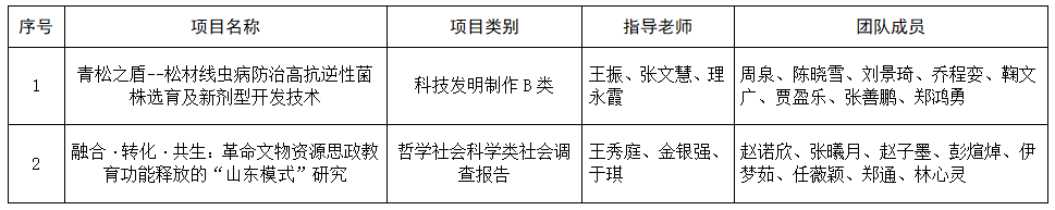 根据团中央、团省委关于开展第十九届“挑战杯”全国大学生课外学术科技作品竞赛作品申报工作的有关要求,经校赛、省赛选拔,我校拟推荐《青松之盾--松材线虫病防治高抗逆性菌株选育及新剂型开发技术》等2件作品参加第十九届“挑战杯”全国大学生课外学术科技作品竞赛,公示如下。