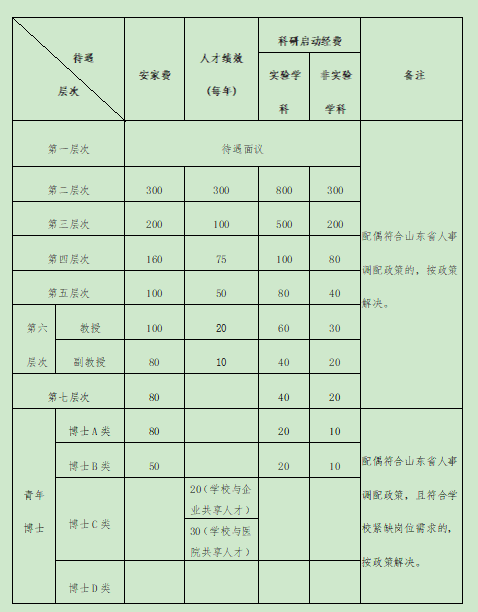 (一)各类引进人才除享受国家及学校规定的基本工资待遇外,学校在安家费、科研启动经费等方面提供如下待遇:(人民币,单位:万元)
