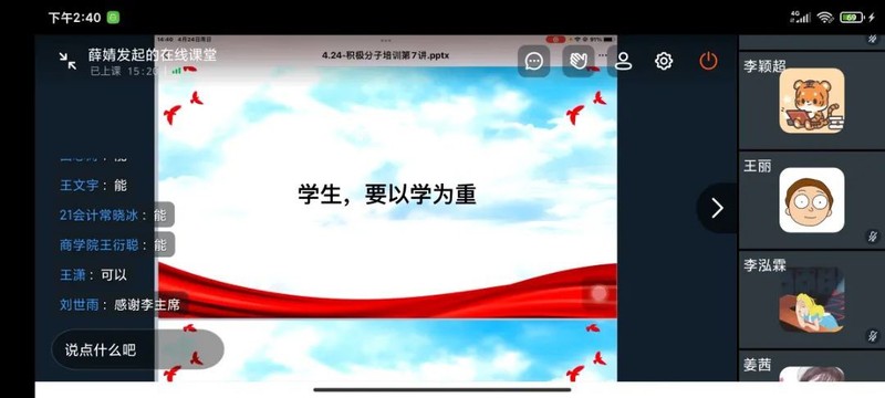 4月24日下午,商学院第22期入党积极分子培训班第七讲于线上召开,本次会议由商学院优秀校友李颖超主讲,陈晓丽老师主持培训会。