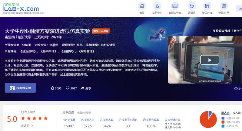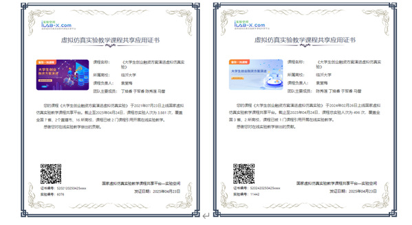 《大学生创业融资方案演进虚拟仿真实验》是商学院虚拟仿真团队自主设计开发的,课程2021年获评第二批山东省虚拟仿真类一流本科课程,并推荐参与国家级一流本科课程的评审,2024年对课程做了一次升级改造,继续推荐加第三批国家级一流本科课程的评审。原课程于2021年07月23日上线国家虚拟仿真实验教学课程共享平台。截止至2025年04月24日,课程总实验人次为3,881次,覆盖全国7省、2个直辖市、16所高校,课程已被2门课程引用开展在线实验教学。升级改造后的课程于2024年02月26日上线国家虚拟仿真实验教学课程共享平台。截止至2025年04月24日,课程总实验人次为496次,覆盖全国3省、2所高校。课程团队成员近年来获国家级和省部级教改项目6项,2023年出版实验对应教材1部。