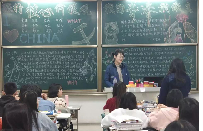 本网讯 为积极响应和学习党的十八大和十九大历次会议全会精神,让团员了解“社会主义核心价值观”的深刻内涵,更好地明确做优秀共青团员的方向,3月17日晚,我院2018级学生在各班团支书的带领下于各班自习室开展了“践行核心价值观,我的青春我担当”的主题教育活动。