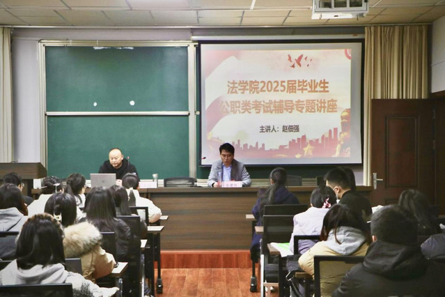 近日,法学院邀请文学院副教授、中国现当代文学专业博士赵佃强在303会议室举办申论写作辅导讲座。学院2025届毕业生和其他年级学生代表参加。讲座由学院学工办副主任张建伟主持。