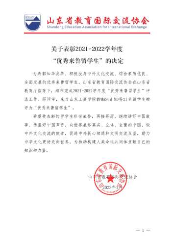 近日,山东省教育国际交流协会发布《关于表彰2021-2022学年度“优秀来鲁留学生”的决定》。学院科特迪瓦籍国际学生乔瑞获2021-2022学年度“优秀来鲁留学生”称号。