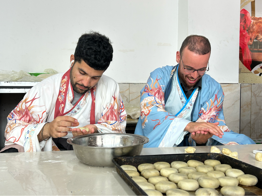 之后,留学生们品尝了大岱村当季收获的粮食:花生、红薯、玉米,以及临沂特色美食:临沂炒鸡、蒸河鱼、煎饼果子与锅饼。