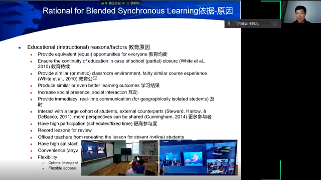 王其云教授结合自己最近五年从事的混合同步教学研究与实践,分别从理论和实践两个层面介绍如何从教学法、社交互动、以及技术层面进行教学设计与实践,从而保证课堂内及网上学生的学习体验与效果;如何有效组织课堂内与网上学生之间的小组合作及学习任务的协同完成;如何促进网上学生的学习参与及认知投入程度等内容。