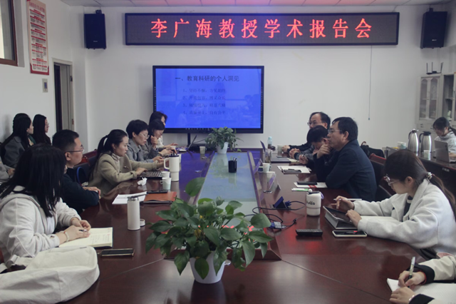 为深化教育研究,促进我院内涵建设,4月14日上午,广西师范大学教育学部李广海教授应邀于致远楼①党建活动室作题为“教育科学研究的实践逻辑与写作范式”的学术报告会。我院部分骨干教师及全体硕士研究生参加,报告会由党委书记赵勇主持。
