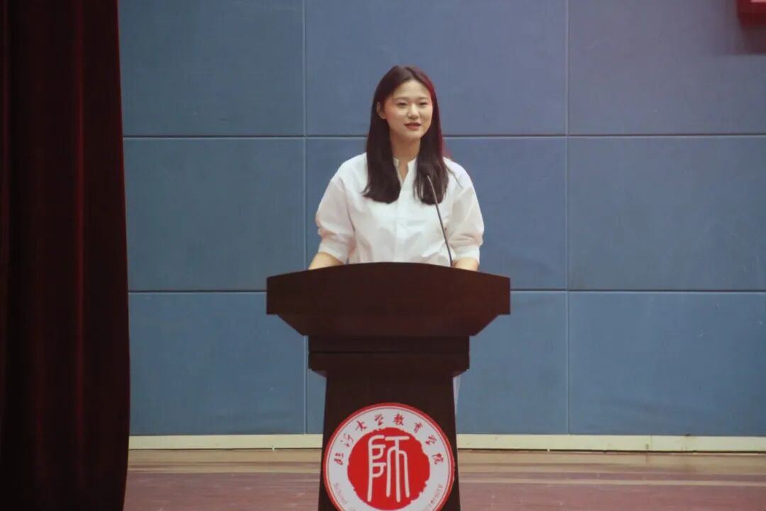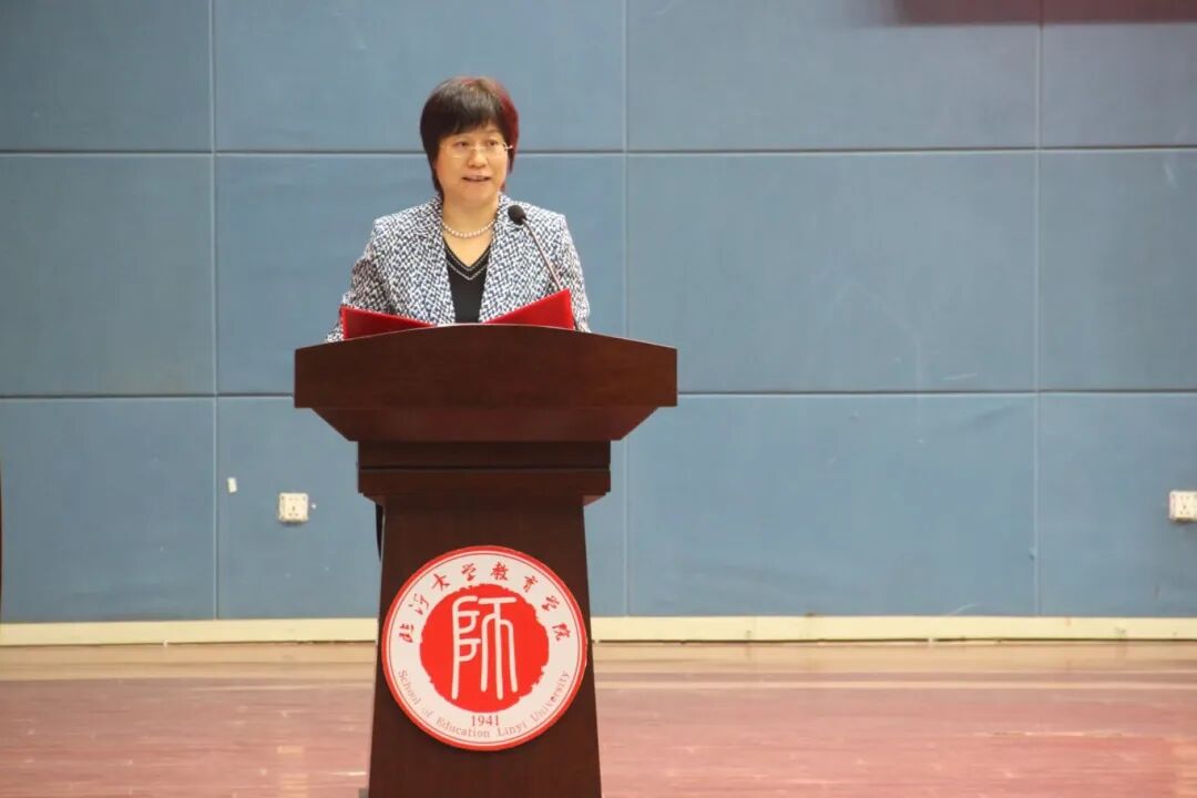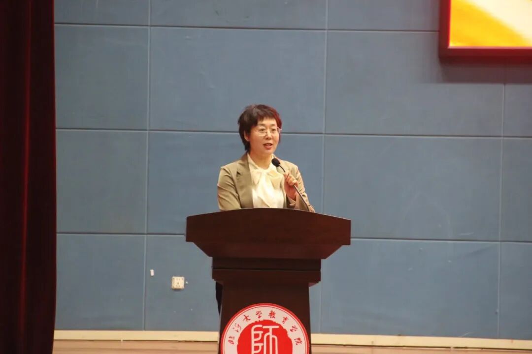 赵金霞致辞,她首先欢迎新生加入教育学院,随后介绍了学院的院训与办学理念,并希望大家坚守教育初心、面向未来学习、传承优良学风,努力成长为兼具教育家精神与创新能力的栋梁之才,为教育事业贡献力量,续写学院荣光。