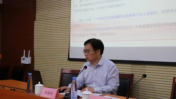 根据党纪学习教育有关要求和学校工作安排,5月7日下午,学校党委委员、副校长池福安于致远②号楼106会议室为分管单位教工党员上党纪学习教育专题党课。