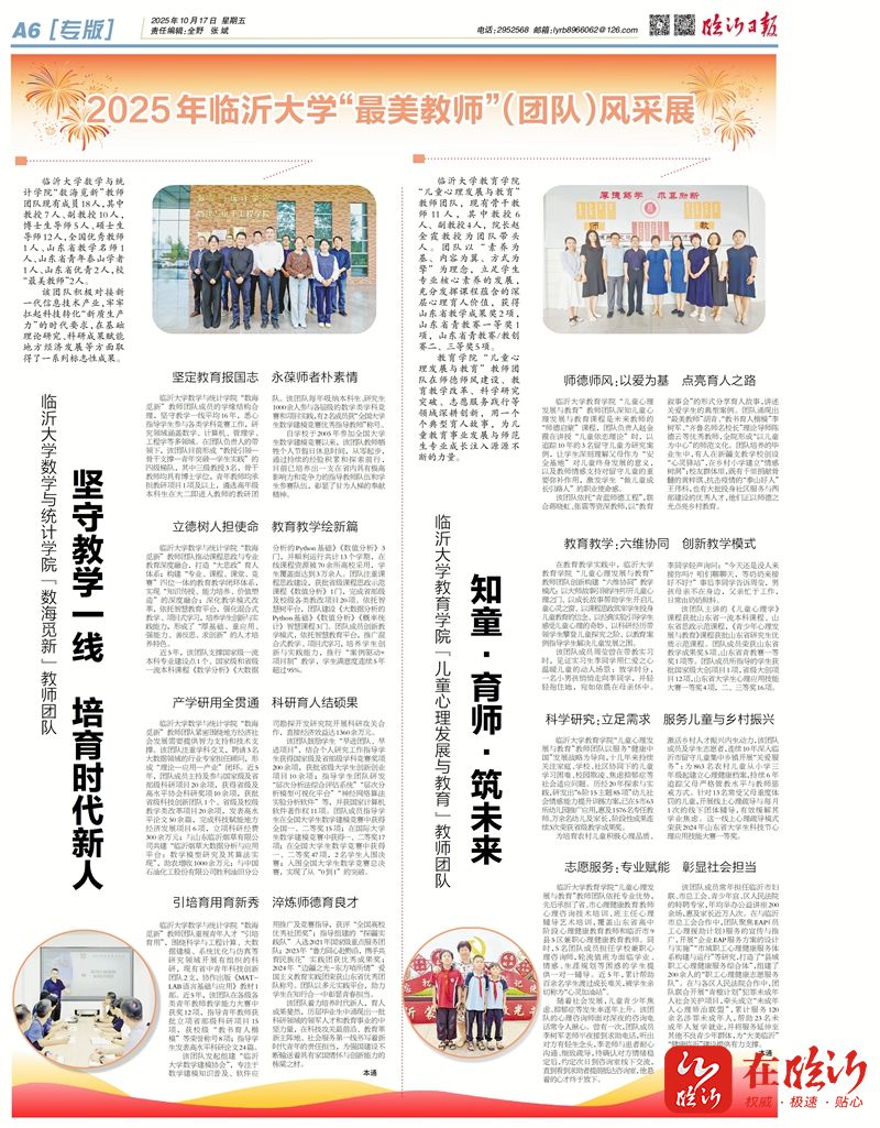 在临沂客户端讯 米兰体育官网入口数学与统计学院“数海觅新”教师团队现有成员18人,其中教授 7 人、副教授 10 人,博士生导师 5 人、硕士生导师12人,全国优秀教师1 人、山东省教学名师 1人、山东省青年泰山学者1 人、山东省优青 2 人,校“最美教师”2人。该团队积极对接新一代信息技术产业,牢牢扛起科技转化“新质生产力”的时代要求,在基础理论研究、科研成果赋能地方经济发展等方面取得了一系列标志性成果。