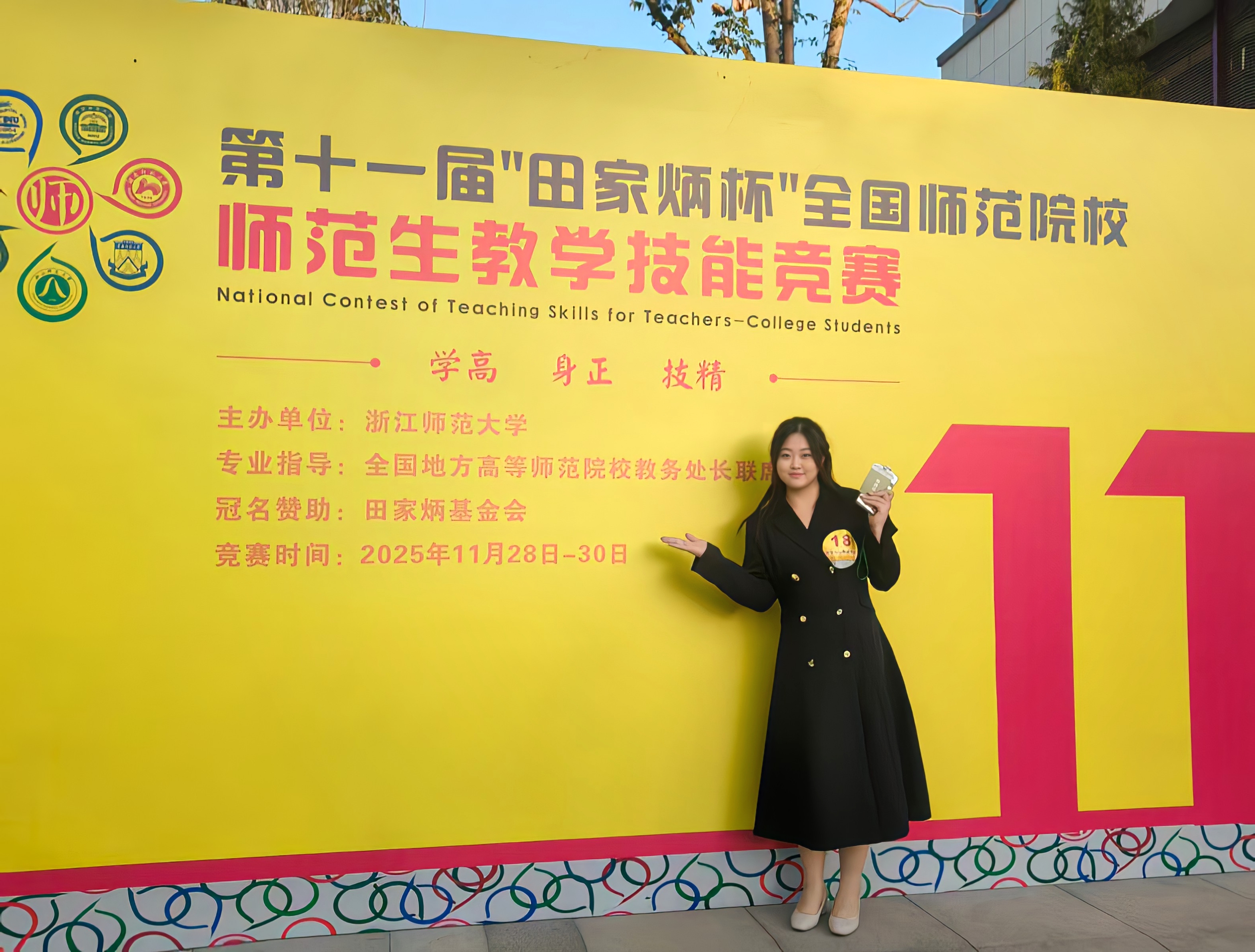 “田家炳杯”全国师范院校师范生教学技能大赛素以赛制严格、专业性强、规模宏大而著称。本届比赛10月份通过全国初赛评审,11月28日进入决赛阶段。决赛现场选手需在抽题后限时脱网备课,制作教学设计和PPT,并进行现场授课及即席讲演,全面考察学科素养、教学能力与临场应变水平。陈晓楠同学在全国高水平的师范生竞技舞台上,展现了数统学子的扎实功底与良好风貌。