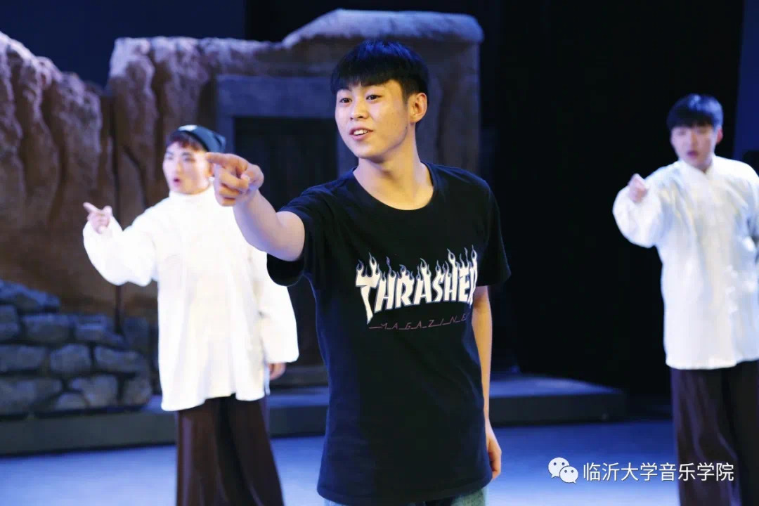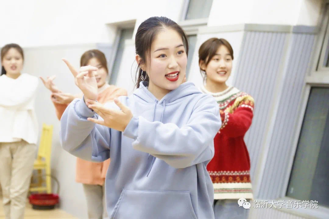 学习柳琴戏的过程,虽是苦的,但却是很有趣的。从最开始的学唱,老师一字一句的教我们唱着这段《喝面叶》,不断的给我们纠正发音,教我们用地方方言去唱出那独特的韵味。在学唱中,我们开始排练起了走台,学习动作。