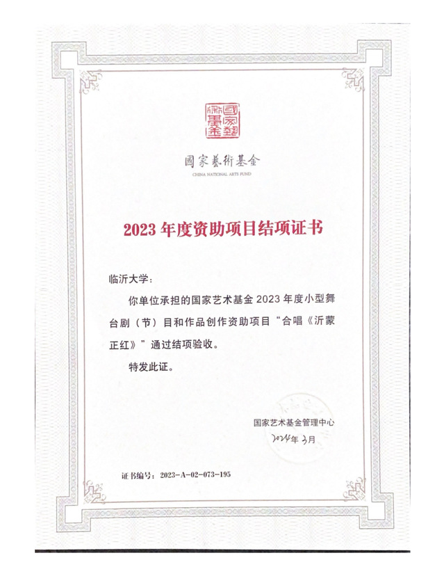 混声合唱《沂蒙正红》于2023年获得国家艺术基金小型舞台剧(节)目和作品创作资助项目立项,历经主创团队的多次精心打磨和提升,在国家大剧院等地参与多场演出,《人民日报》、新华社及搜狐等国内主流媒体均对此作品进行了报导并引发了广泛的社会关注与讨论,现已顺利圆满完成结项任务。