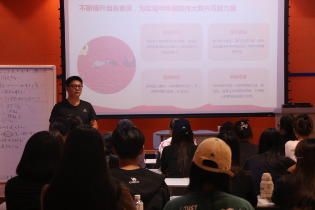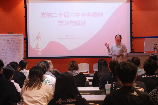 我院团委副书记蔡晓青以《中国共产党的性质、根本宗旨,新时代中国共产党的历史使命》为题,阐述了中国共产党的性质和根本宗旨即全心全意为人民服务。蔡晓青老师带领同学们讨论了新时代中国共产党的历史使命,即实现中华民族伟大复兴的中国梦,指出全体党员应紧密团结在党的周围共同奋斗。同时结合党的二十届三中全会精神,鼓励同学们将自身所学应用到中国式现代化的建设中,为民族复兴贡献力量。