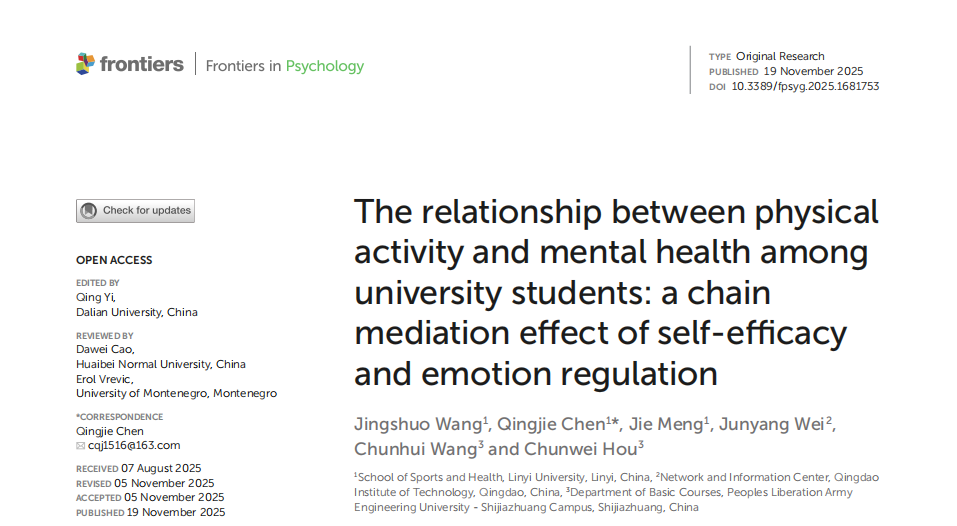 近日,学院2023级研究生王靖硕在导师陈庆杰教授指导下,以第一作者身份在SSCI收录的国际知名期刊《Frontiers in Psychology》上发表了题为《The relationship between physical activity and mental health among university students:a chain mediation effect of self-efficacy and emotion regulation》学术论文。这是学院培养研究生以来首次在该级别期刊上发表研究成果,标志着学院研究生在高水平社会科学研究成果产出上实现了“零的突破”,是学院人才培养与科学研究质量提升的重要里程碑。