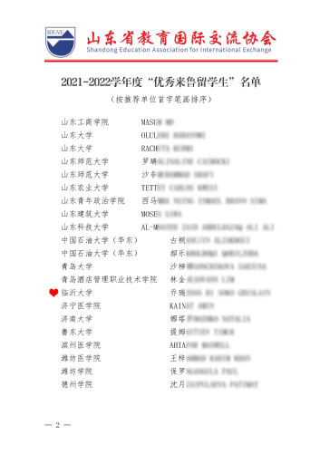 Recently, the Shandong Education International Exchange Association issued the Decision on Commendation of Outstanding Students from Shandong in the 2021-2022 academic year. Jori, an international student from the Cote d'Ivoire, won the title of Outstanding Students from Shandong in the 2021-2022 academic year.