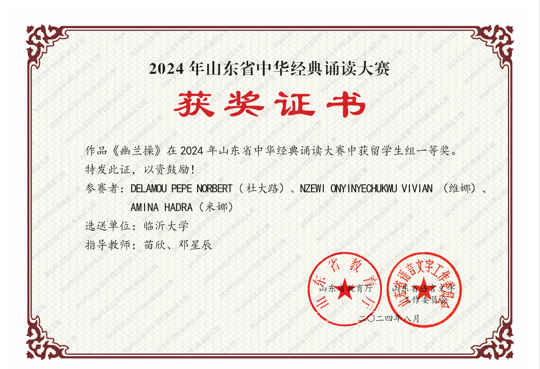 In recent years, international students of Linyi University have performed outstandingly in the Shandong Chinese Classics Recitation Competition and achieved great results. He achieved remarkable results in this year's competition, winning two first prizes in one fell swoop. Among them, the work Yu Lan Jiao led by Miao Xin and Deng Xingchen, NZEWI ONYINYECHUKWU VIVIAN , AMINA HADRA and other students participated in the competition, and the work Poetic China led by Liu Honglei and Liu Guiyang, and the work Poetic China participated in the competition, both stood out and won the honor, and the four instructors were awarded the title of Excellent Instructor. This achievement is not only a high recognition of the personal efforts of participating students, but also a new breakthrough in the educational achievements made by Linyi University in international student education and training, fully demonstrating the school's remarkable achievements in the integration of cross-cultural language education and the dissemination of traditional Chinese culture.