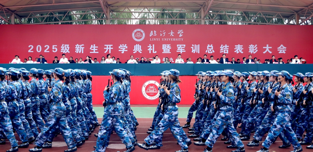 张书圣致辞,代表全校师生向2025级新同学表示欢迎,向受到表彰的军训先进集体和优秀个人表示祝贺。他指出,军训是大学生活的“第一课”,同学们以挺拔的军姿、整齐的队列、昂扬的风貌,将青春的热血与担当融入每一个动作,完美诠释了新时代青年的精气神。希望同学们一要厚植家国情怀,传承沂蒙精神,要把个人理想融入国家发展、老区建设的浪潮中,让青春在为祖国、为人民的奉献中绽放光彩。二要涵养优良品德,塑造健全人格,要将“有信仰、能吃苦、善创新、敢担当、乐奉献”的临大特质融入言行,努力成为一个有温度、有情怀、受人尊敬的人。三要坚持终身学习,锤炼过硬本领,要深耕专业知识,主动拥抱人工智能等新技术,让自己在快速变化的时代中拥有“迎风奔跑”的底气。四要守护身心健康,筑牢幸福根基,要培养积极的兴趣爱好,为未来的人生打下坚实的健康基础,努力成为可堪大用、能担重任的栋梁之材,在服务老区发展、助力民族复兴的征程中,书写属于“临大人”的精彩答卷!
