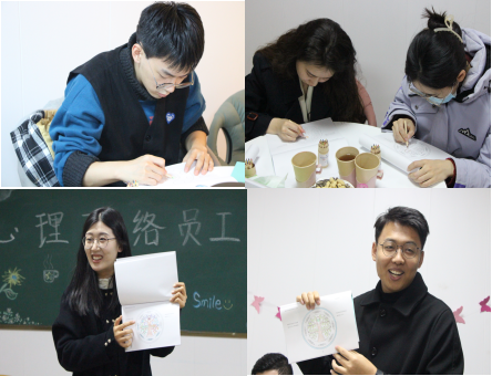随后,在美术学院心理联络员孙勇勇的带领下开启曼陀罗绘画体验。孙勇勇借助肌肉放松、冥想等引导大家进入放松体验,随后指导开启曼陀罗绘画创作。创作结束后在全体成员间进行了曼陀罗漂流和逐一分享,在帮助心理联络员放松心情的同时也帮助大家增加了对自我和彼此的认识。