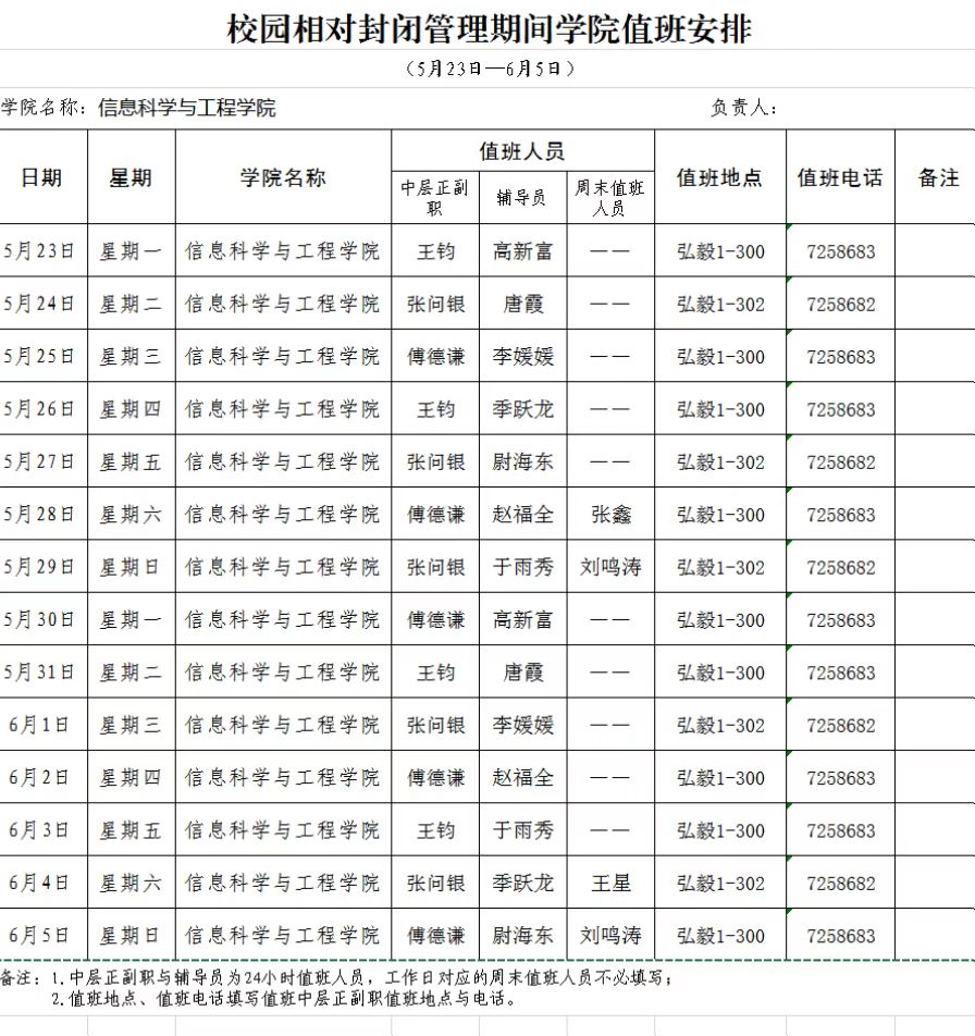 信息科学院与工程学院值班安排(5月23日至6月5日)