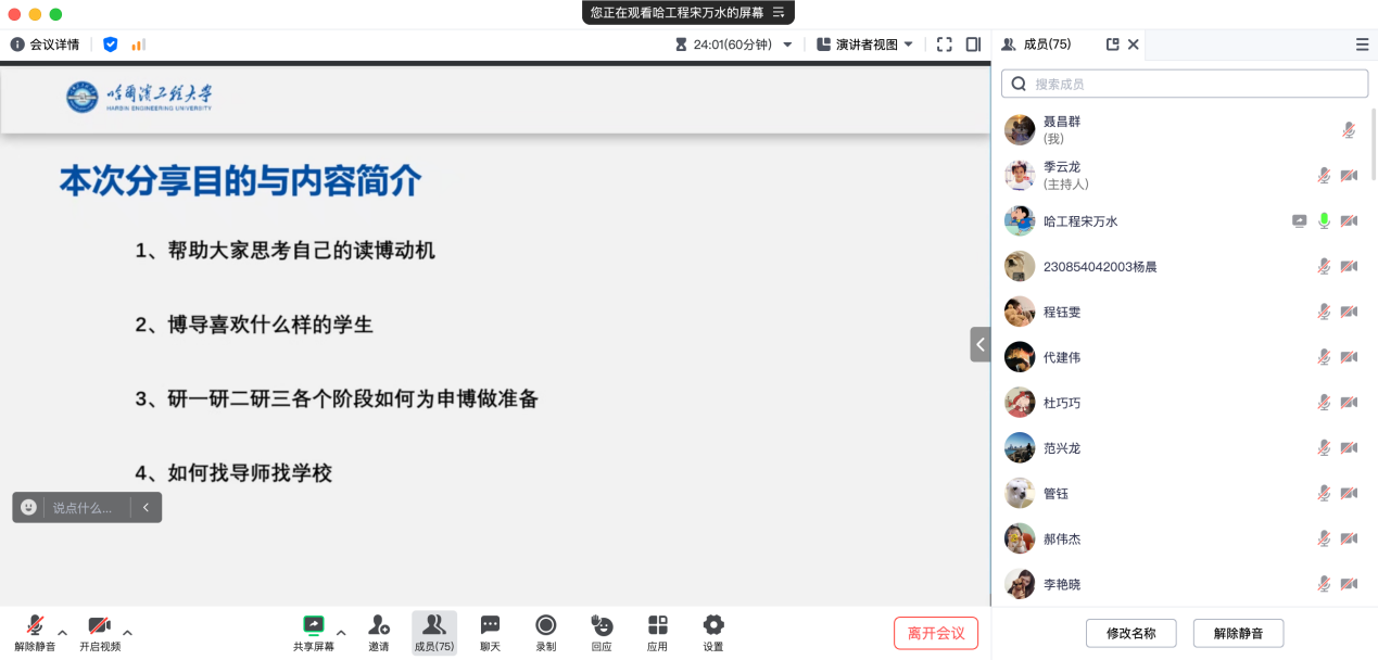 11月14日晚,我院考博经验分享交流会于线上成功举办。研究生会特邀请哈尔滨工程大学博士宋万水进行考博经验分享交流。本次经验分享由研究生会学术部季云龙主持,学院22、23级研究生踊跃参加此次分享交流会。