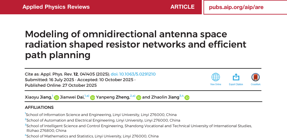 近日,我院江晓雨副教授(第一作者)与2023级硕士研究生代建伟(通讯作者)在国际权威期刊 《Applied Physics Reviews》 发表题为 :《Modeling of omnidirectional antenna space radiation shaped resistor networks and efficient path planning》的研究论文。该期刊为TOP 期刊,动态影响因子 11.9,5年平均影响因子 15.2。该文联合通讯作者还包括米兰体育官网入口自动化与电气工程学院郑彦鹏副教授等。