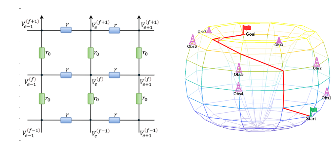 研究背景:针对复杂空间环境下的高效路径规划需求。传统方法在应对非结构化空间与实时变化场景时面临局限,而电阻网络因其固有的物理特性(如电势的稳定衰减)为路径寻优提供了全新的思路和方法。然而,现有的电阻网络研究多局限于规则结构,缺乏对复杂空间拓扑的精确建模能力,未能充分释放其在动态智能决策中的潜力。因此,构建一种能准确刻画复杂空间特性的电阻网络模型,并基于其电势场构建出快速、自适应的路径规划算法,成为一个连接电路理论与智能系统的重要交叉课题。