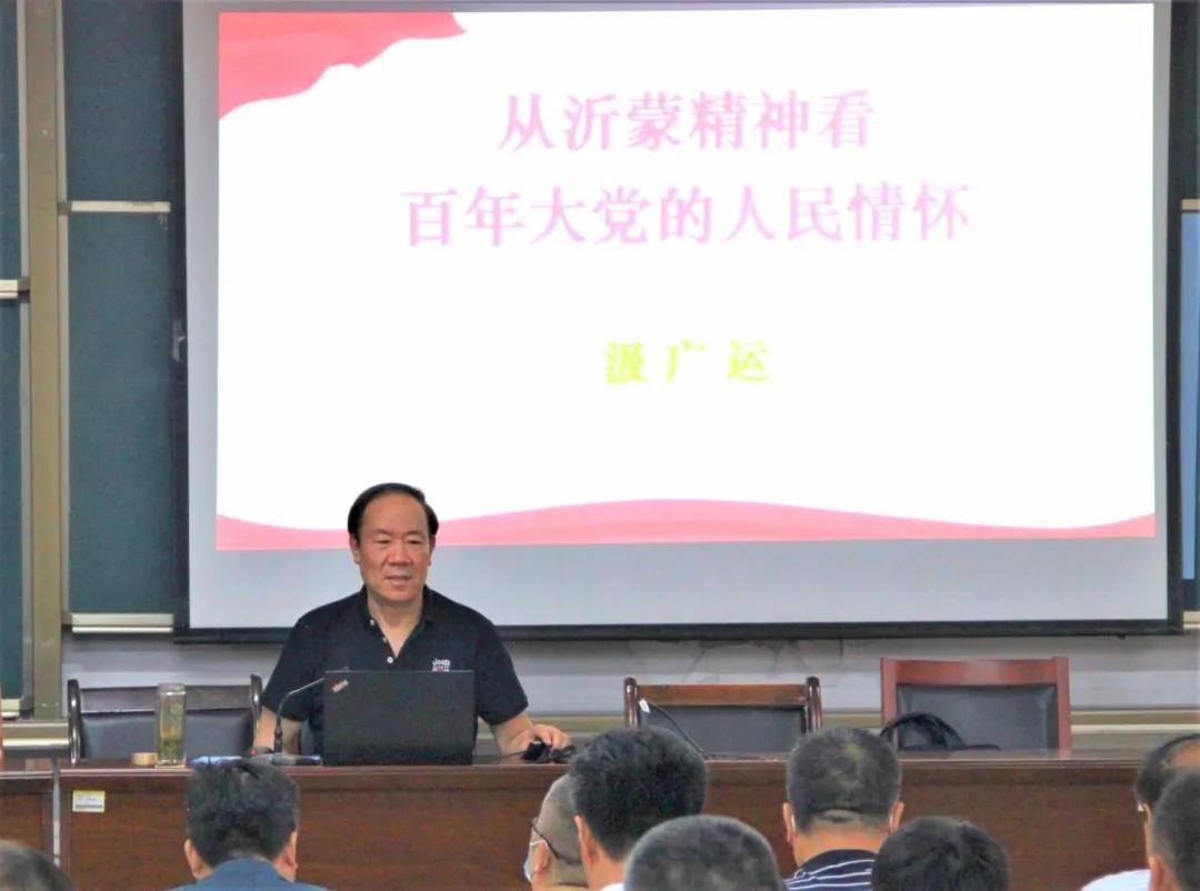 沂蒙精神是党政军民水乳交融、生死与共铸就的,蕴含着百年大党一心为民的崇高品质和博大情怀。汲广运教授用丰富鲜活的事例、故事和图片从“沂蒙”及其历史文化地位、革命领袖论“人民”、党与人民的“伦理”关系、沂蒙精神蕴含着共产党一心为民的情怀、人民群众一心向党是党的人民情怀的正向映射五方面作报告。