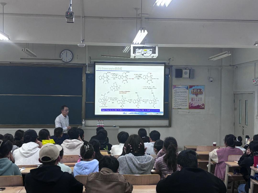 韩福社教授介绍了课题组镍催化的铃木偶联反应高效合成沙坦类降血压药物骨架;详细介绍了课题组发展的不对称Michael/aldol串联反应、季碳手性中心的不对称构建、环状1,3二羰基化合物的去对称对映选择性还原新方法及其应用于依波加类、白坚木类、萜类系列复杂天然产物的全合成研究。剖析了天然产物全合成的设计理念,复杂桥环、多环并环合成难题解决思路,季碳手性中心的催化不对称合成等。与会师生就相关问题与韩教授进行了热烈的交流与讨论。讲座最后,杨文强副教授做了总结性发言,感谢韩福社教授做的精彩的报告。
